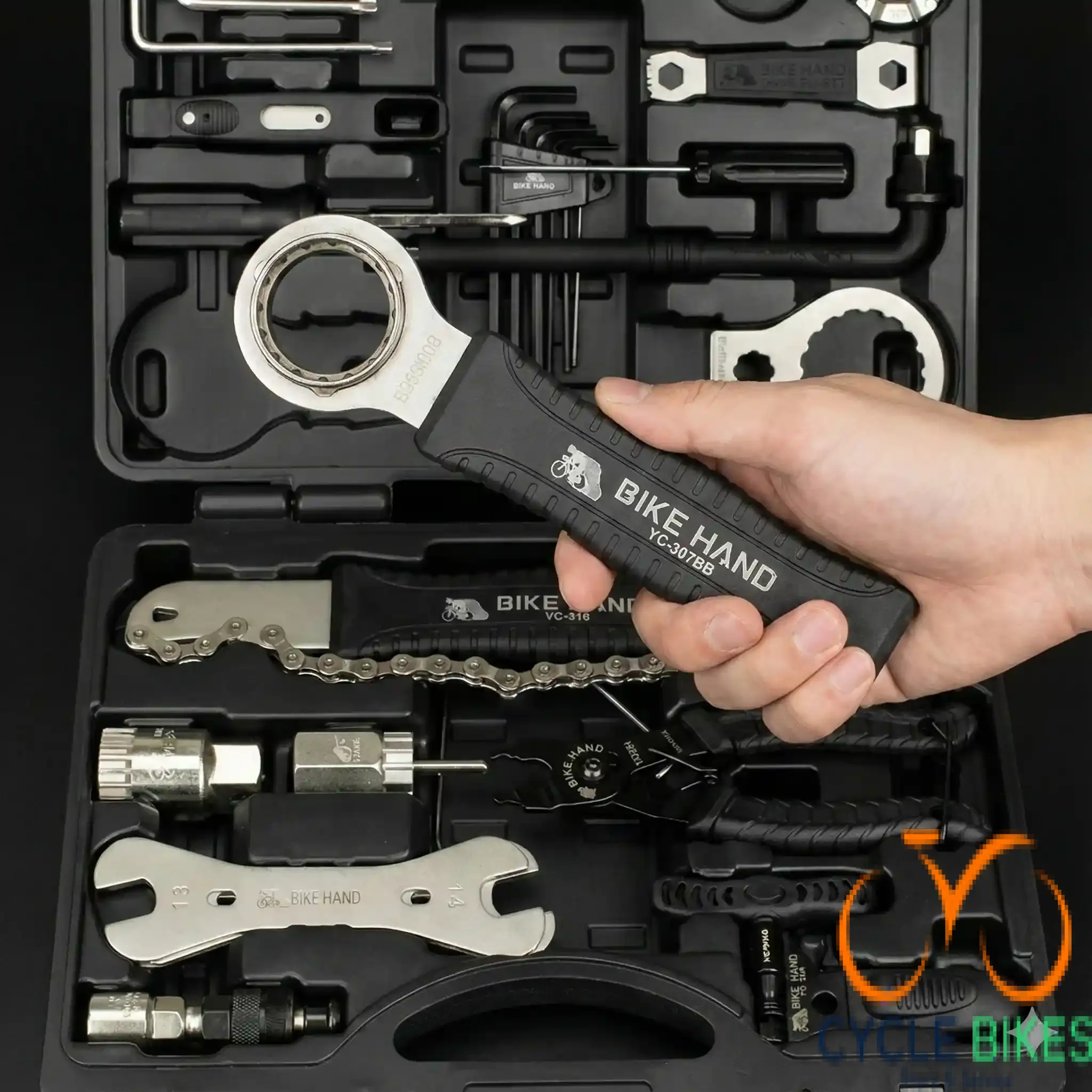 The Bike Hand YC-721-CN Professional Bicycle Tool Kit is a complete set of essential tools for bike maintenance, repair, and upgrades. With 18 high-quality tools, this kit covers everything from drivetrain servicing and wheel adjustments to brake and gear tuning. Each tool is crafted for durability and precision, making it suitable for home mechanics and professional workshops. Packed in a sturdy carrying case, it keeps tools organized and portable, ensuring you always have the right equipment for any cycling repair job.