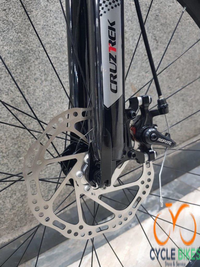 The Cruztrek Komendo 26 Aluminum Frame Mountain Bike is built for riders who want strength, control, and performance in one versatile package. Its lightweight aluminum frame makes handling easier while ensuring long-lasting durability, perfect for beginner and intermediate mountain bikers. The 26-inch wheels fitted with wide all-terrain tires deliver excellent grip and stability, whether you’re tackling rough trails, gravel paths, or smooth city roads.
