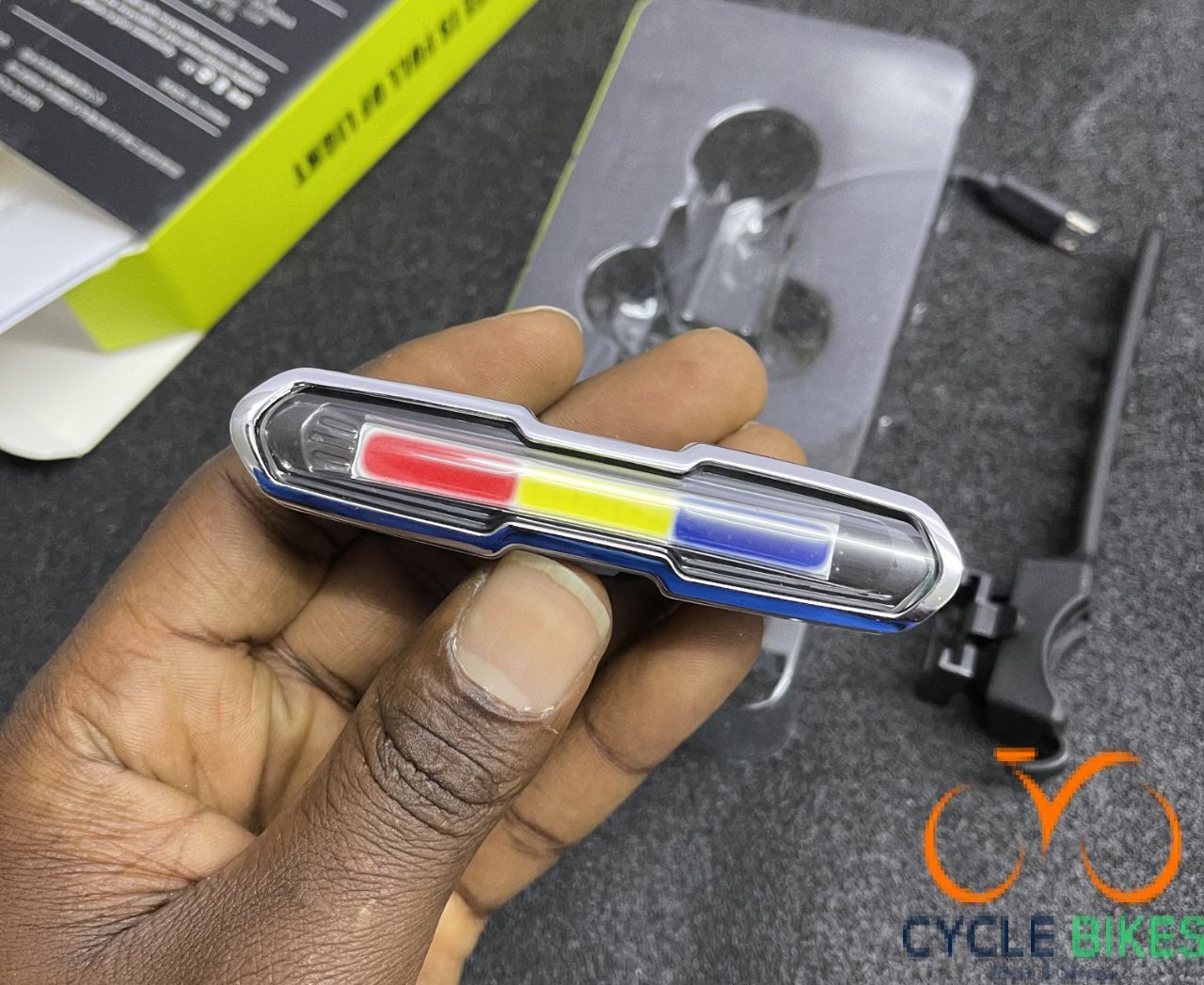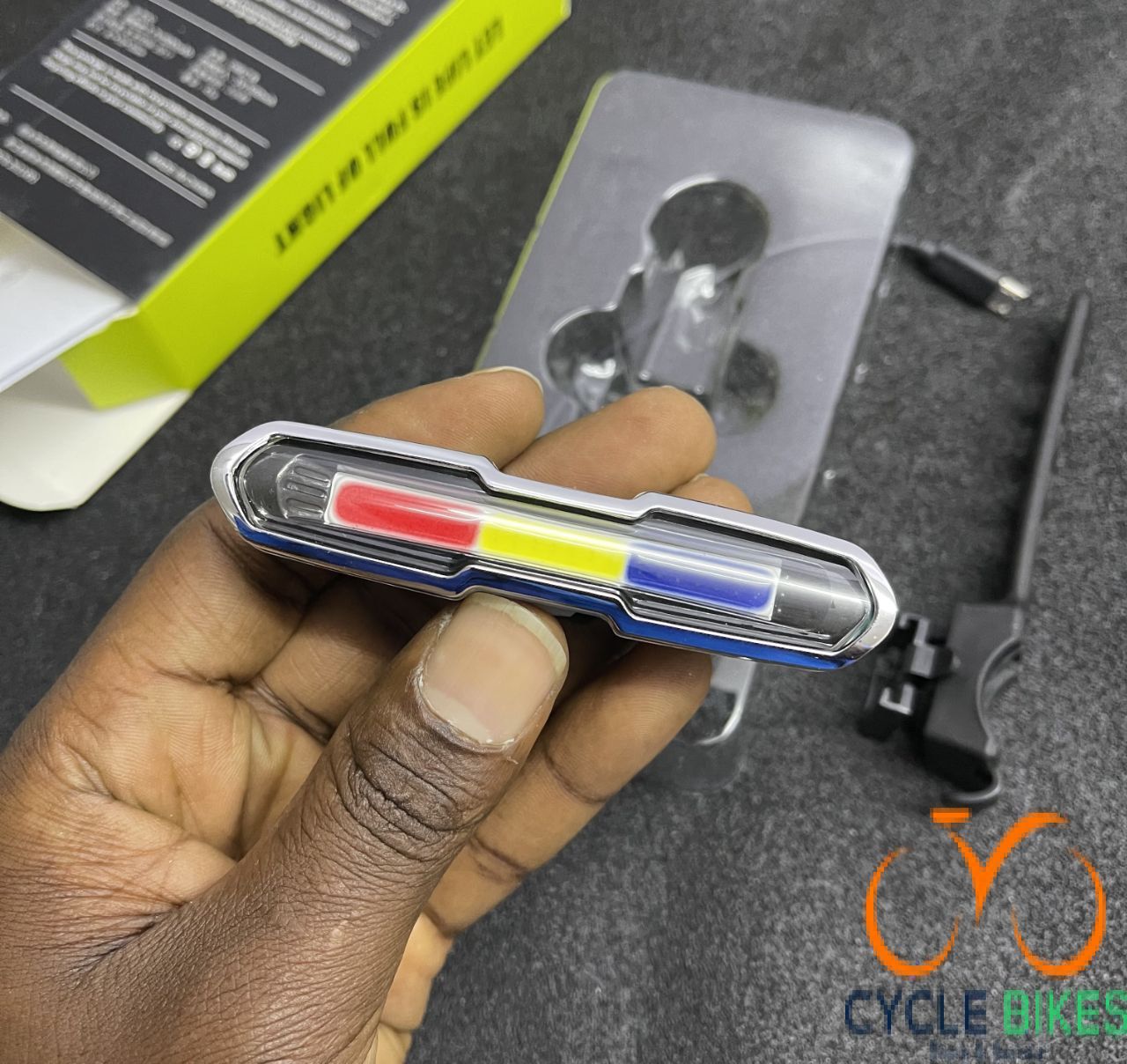 This USB rechargeable tail light delivers strong, vibrant multicolored illumination for improved visibility and safety on the road. Its long-lasting rechargeable battery ensures convenience without constant battery replacements, while multiple lighting modes let you choose between steady or flashing effects. The lightweight, weather-resistant design ensures reliable performance in all conditions, and the easy mounting system makes it suitable for most bicycles. Stylish, practical, and highly effective, it’s an essential accessory for any cyclist riding in low-light or nighttime conditions.