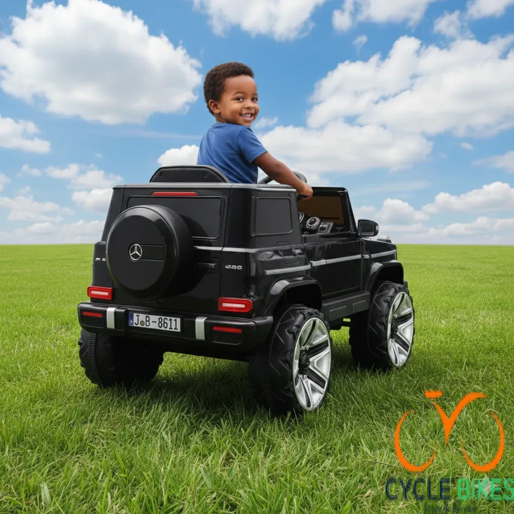 The Mercedes-Benz AMG G63 electric ride-on car for kids delivers a premium and realistic driving experience inspired by the iconic luxury SUV. Designed with authentic details, it features the official Mercedes-Benz and AMG logos, signature round headlights, and opening doors for a true-to-life look. Children can enjoy independent driving using the steering wheel and foot pedal, while parents maintain full control with the included remote control, ensuring added safety. Powered by a 12V rechargeable battery and twin motors, the car offers smooth and reliable performance. Safety is a priority, with a soft start system for gentle acceleration, anti-slip tyres for stability, and a safety seat belt to keep young drivers secure during every ride.