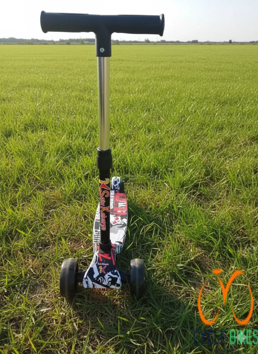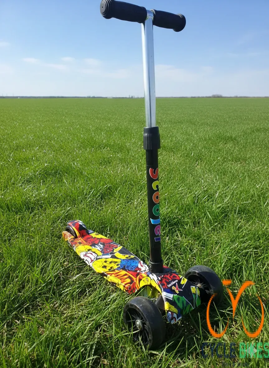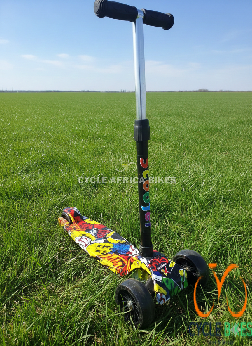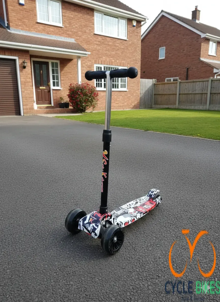 This beginner-friendly three-wheel kick scooter is perfect for young riders learning balance and coordination. Its wide front wheels and stable trike design make it extra safe for kids, while the adjustable T-bar grows with your child for extended use. The scooter features bold, graffiti-style graphics for a cool, urban look, and a lightweight frame makes it easy for parents to carry. Ideal for smooth surfaces like driveways, sidewalks, and home compounds, it combines fun, safety, and style in one ride.