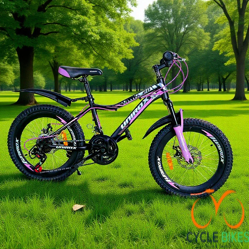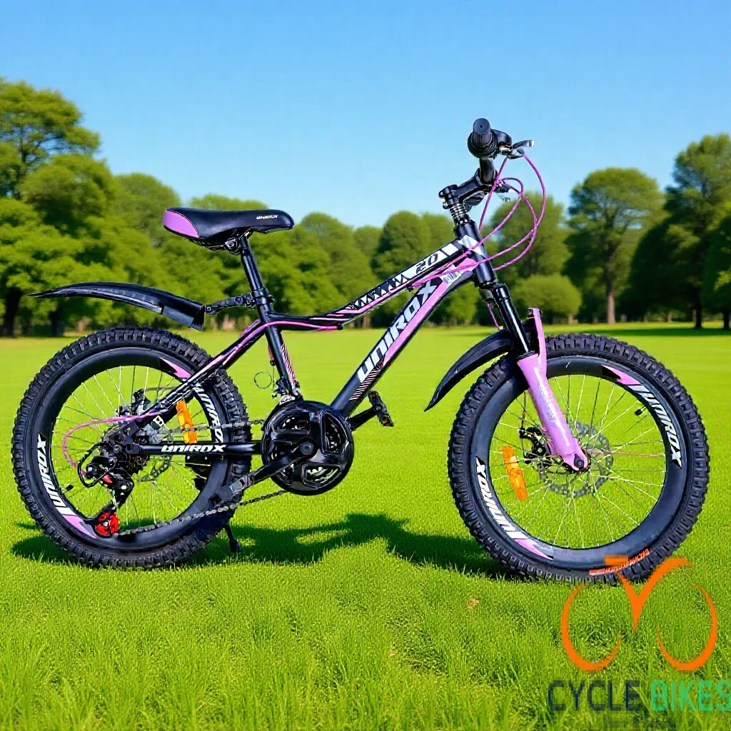 The Super Bike Unirox 20″ Mountain Kids Bike is designed for young riders who love style, adventure, and comfort. With a durable steel frame and 20-inch wheels, this bike is perfect for kids aged 7–10 years (height approx. 115–135 cm). It is built with a sporty mountain bike design, ideal for school rides, park adventures, and weekend fun. The front suspension fork absorbs shocks on rough paths, while the reliable front and rear brakes provide safe stopping power. A soft, padded saddle and easy-grip handlebars ensure a smooth, enjoyable ride every time. It is available in pink colour. It combines performance, safety, and stylish looks — the perfect choice for active and confident kids.